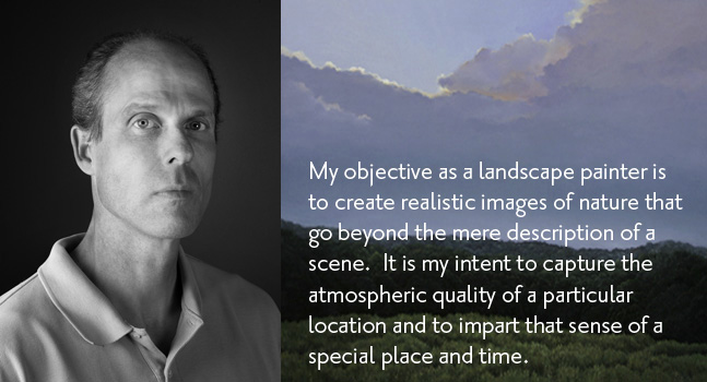 |  | I have always been fascinated by nature.  Growing up in Oregon afforded me the opportunity to appreciate and absorb the beauty, complexity, and grandeur of the land.  As an artist, I am drawn to painting images of the natural world that capture my imagination and my respect. I have painted since childhood and my style and technique has evolved through the years.  As a painting conservator, I've had the added opportunity to carefully scrutinize and evaluate the working methods of the masters of the 19th and 20th Centuries.  This study has certainly influenced and aided my growth as an artist, and has allowed me to more precisely achieve the results I desire in my personal creative efforts. My objective as a landscape painter is to create realistic images of nature that go beyond the mere description of a scene.  It is my intent to capture the atmospheric quality of a particular location and to impart that sense of a special place and time.  For the last ten years, the focus of my work has been the rural landscape of the Connecticut Litchfield hills.  Some of these locations I am fortunate enough to pass by often and am reminded why I have chosen to live in this beautiful place.